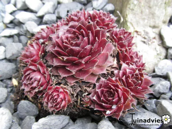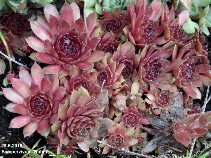 Sempervivum 'Rubin' is een zodevormende plant die rozetten vormt met vlezige, ovale, roodbrons tot bruinrode bladeren met rode punten.