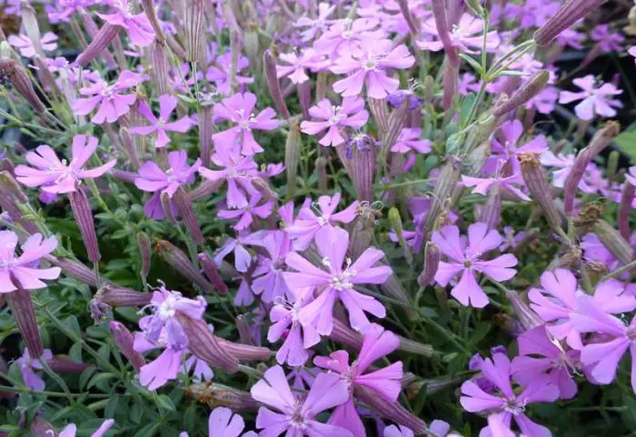 Silene schafta 'Splendens' is een rijkbloeiende bodembedekkende rotsplant, die het ook tussen de voegen van de stenen in een stapelmuurtje goed doet.