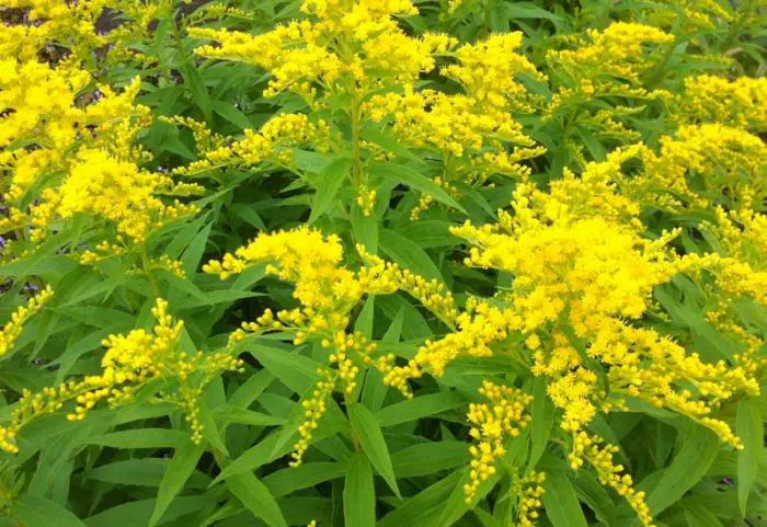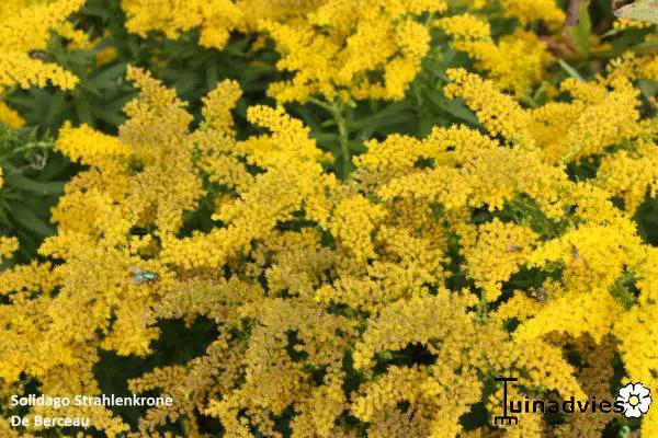 Solidago 'Strahlenkrone' rechtopstaande vaste plant met smal lancetvormig, dun getand, donkergroen blad.