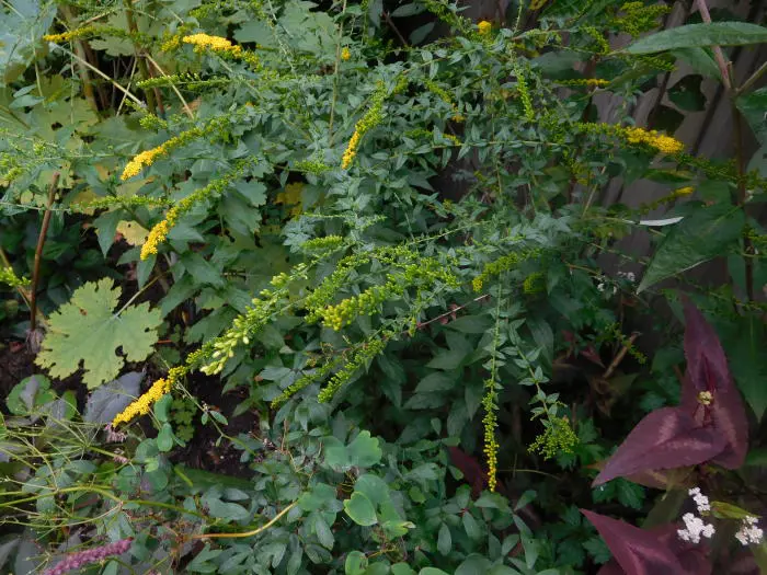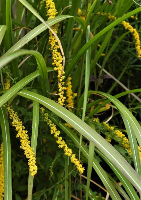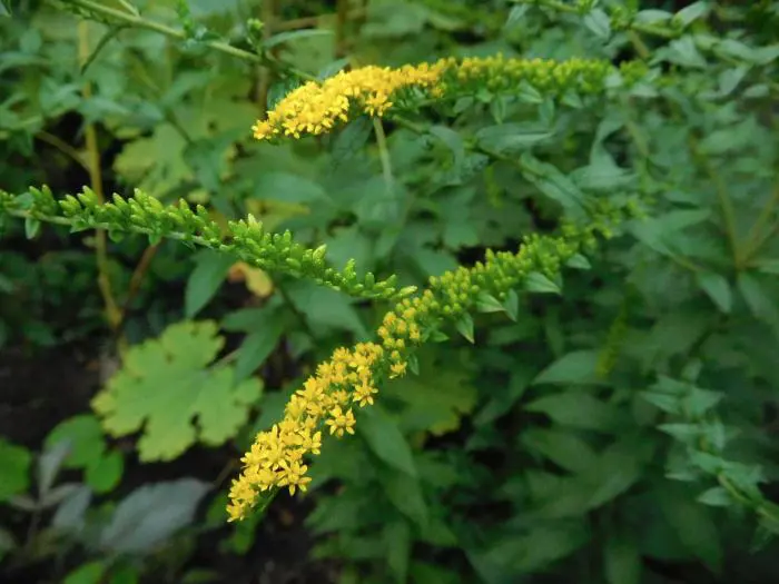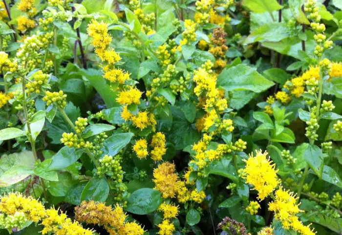Bloeit iets later met dichte, gebogen pluimen van kleine, goudgele bloemen.