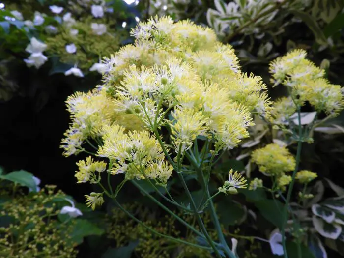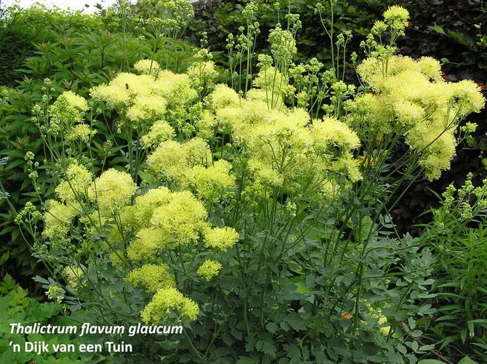 Thalictrum flavum subsp. glaucum is een rizomateuze vaste plant met een bossige groeiwijze en blauwgroen gevederd blad met een royale bloei van lichtgele bloemen met lange felgele meeldraden.