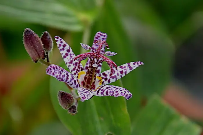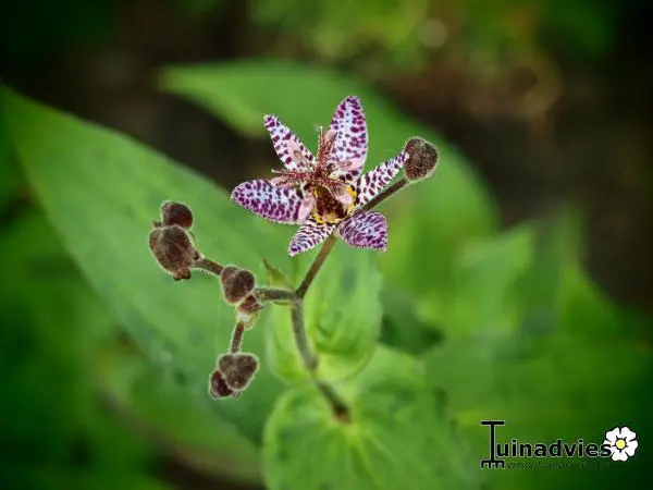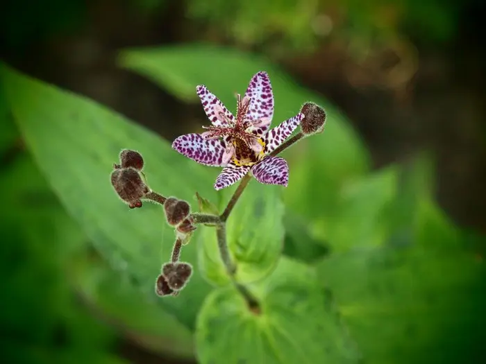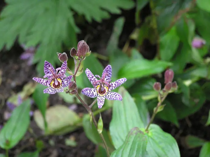 De bloemen Tricyrtis formosana 'Dark Beauty' lijken op kleine paarse lelies, sterk gespikkeld met paars en geeloranje in de keel op stevige stengels.