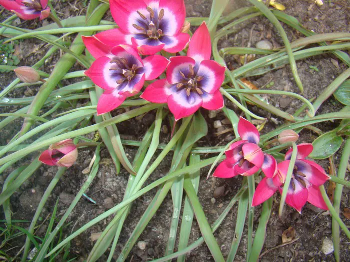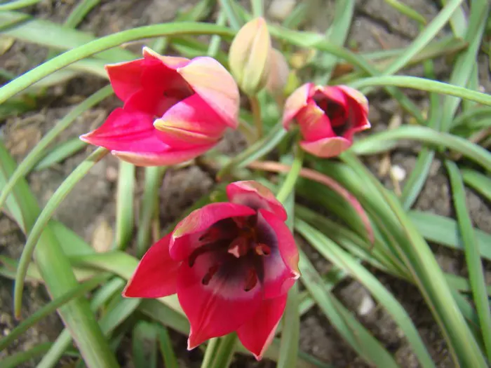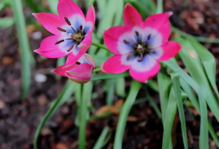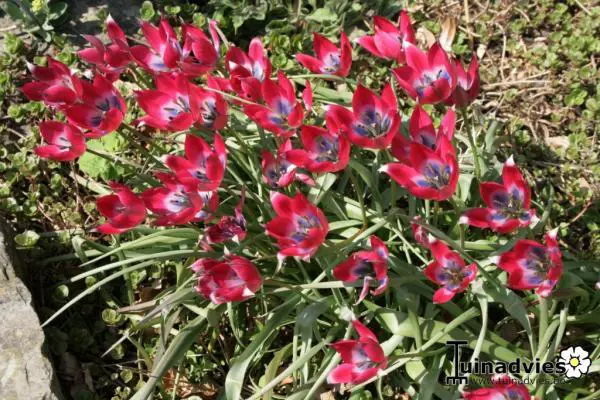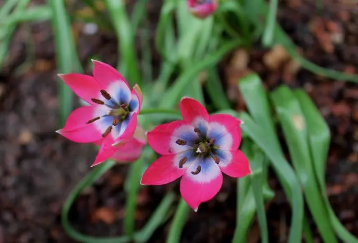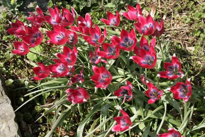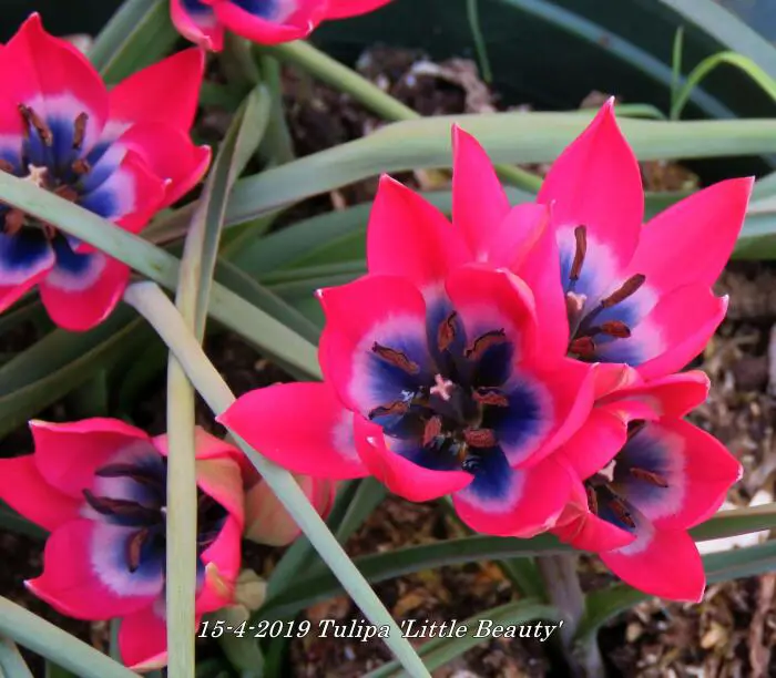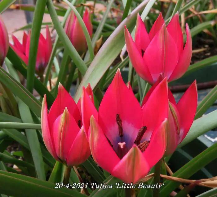 Tulipa 'Little Beauty' bloeit met helder kersenrode bloemen met in het centrum wit en blauw.