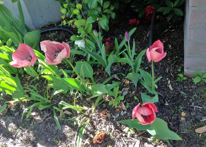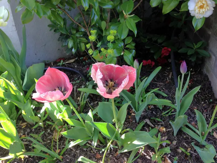 Een Darwinhybride met zalmroze bloemen met wit hart op hoge stelen.