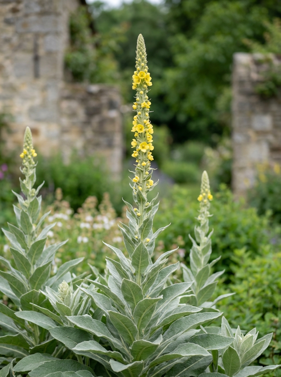 Bloeit in het 2de jaar met enorme hoge toortsen bedekt met gele bloemen geurend naar zoete honing.