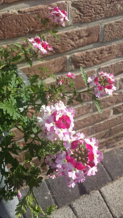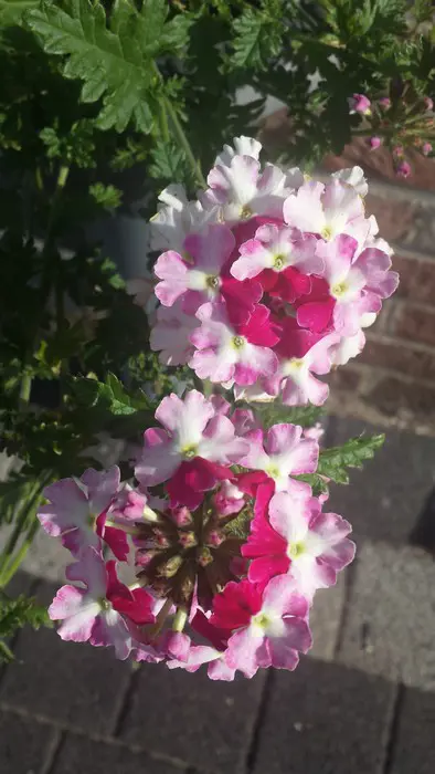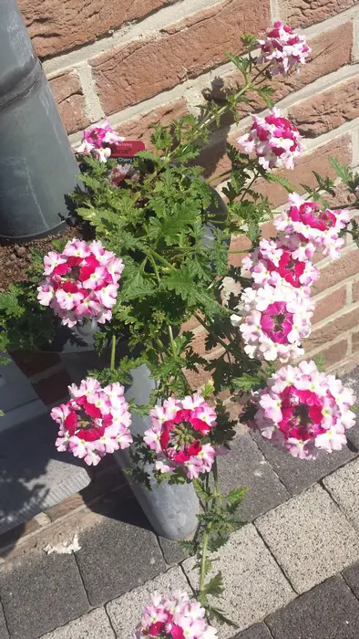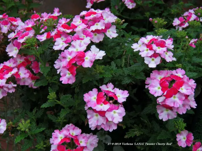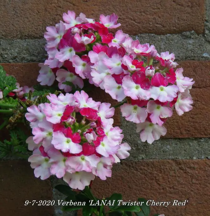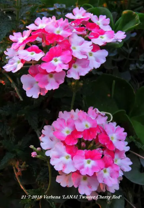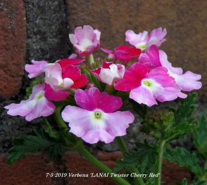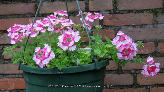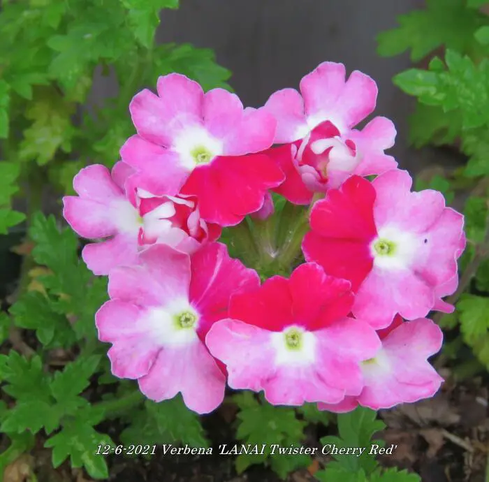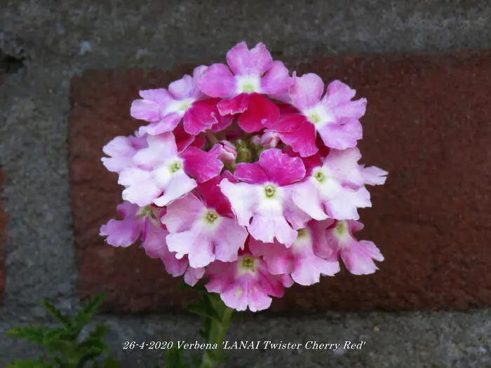 Verbena 'LANAI Twister Cherry Red' bloeit roze met een rood centrum.