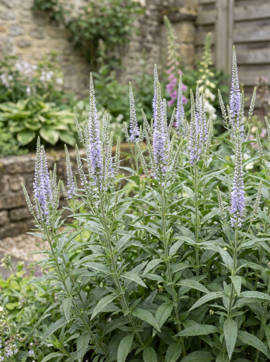 Veronica spicata 'Lila Karina' bloeit met dichte lange, lichtblauwe aren.