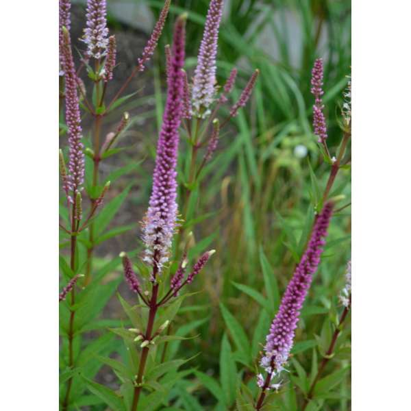 Veronicastrum virginicum 'Erika' is een bossige en stevige plant met goed vertakte lange aren op donkere stengels. De kleurverloop van paarse knoppen en bleekroze bloempjes is bijzonder mooi.
