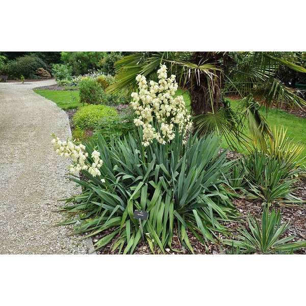 Yucca filamentosa afkomstig uit het zuidoosten van de VS, is een soort voor in de tuin, bloeit met trossen hangende tulpachtige bloemen en steken zowat 1 m boven het gebladerde uit. De bloemen zijn gelig wit van kleur. Het blad is zwaardvormig, stijf en rechtopgaand en wordt 70 cm hoog.