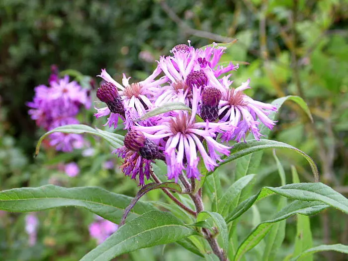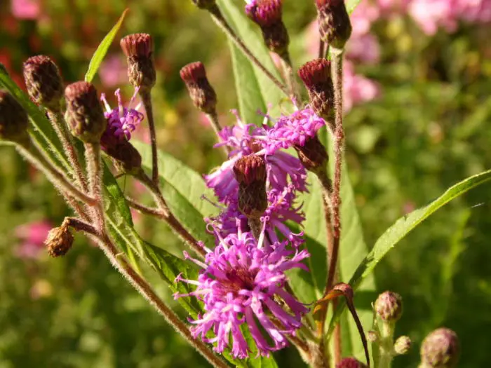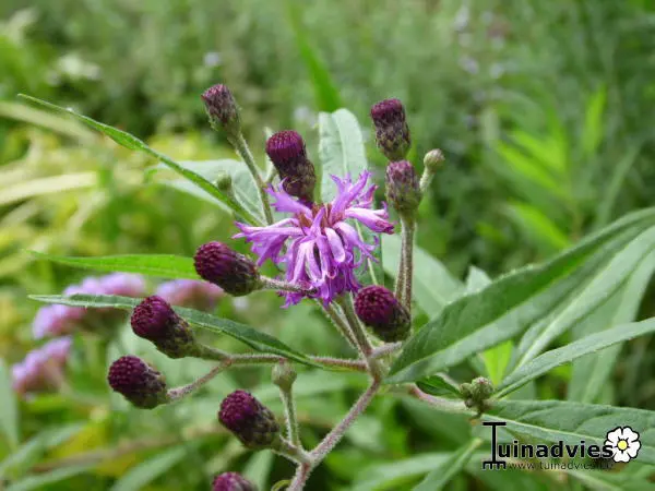Vernonia crinita 'JS Betty Blindeman' zijn stevige, grote planten met bovenaan de stengel bloemtuilen van pluizige paarse pompons.