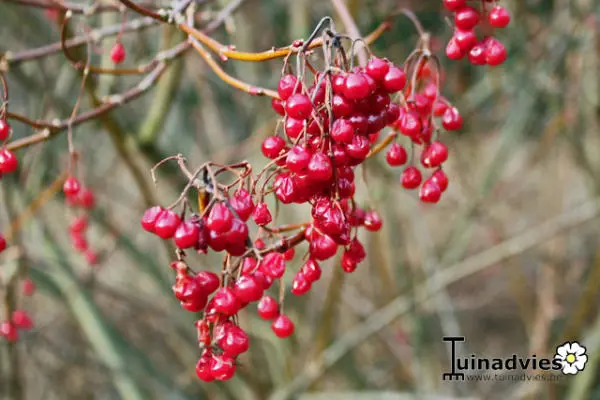 Bloeit met geurende witte bloemschermen gevolgd door hangende hangende rode bessen.