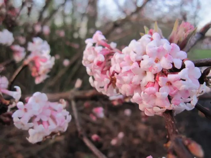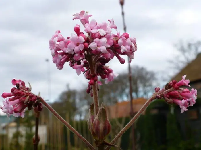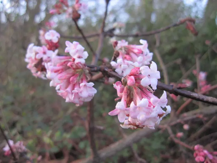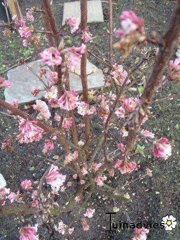 Viburnum × bodnantense ‘Charles Lamont’ is een winterharde, middelgrote heester die van december tot maart uitbundig bloeit met geurige roze-witte bloemen. De plant bloeit op kale takken, een echte eyecatcher in het vroege voorjaar dus.