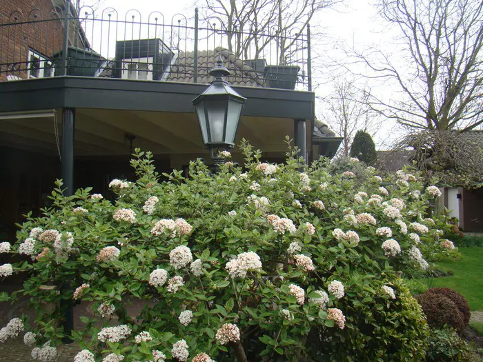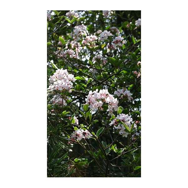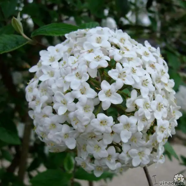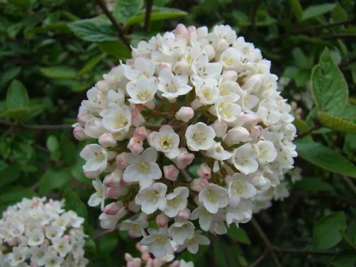 Viburnum x burkwoodii vormt een ronde bossige struik en bloeit met geurende witte bloemen uit roze knoppen, de bedwelmende geur doet denken aan oranjebloesem.