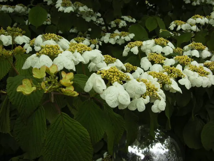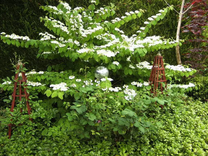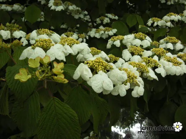 Viburnum plicatum 'Mariesii' is een zeer decoratieve heester afkomstig uit China met breed uitlopende takken die een gelaagd effect geven. Het blad is donkergroen en gerimpeld met prachtige paarsrode herfsttinten. Bloeit in mei met met groenwitte vlakke bloemschermen met witte steriele randbloemen. Na de bloei verschijnen rode bessen die naar zwart rijpen.