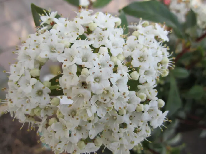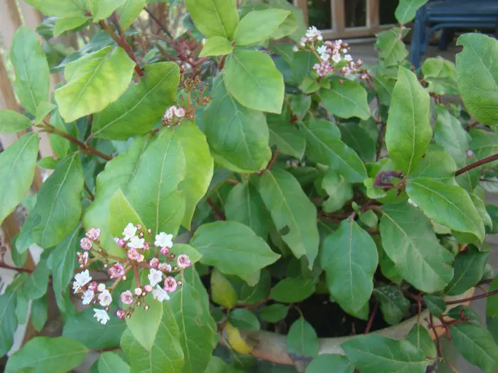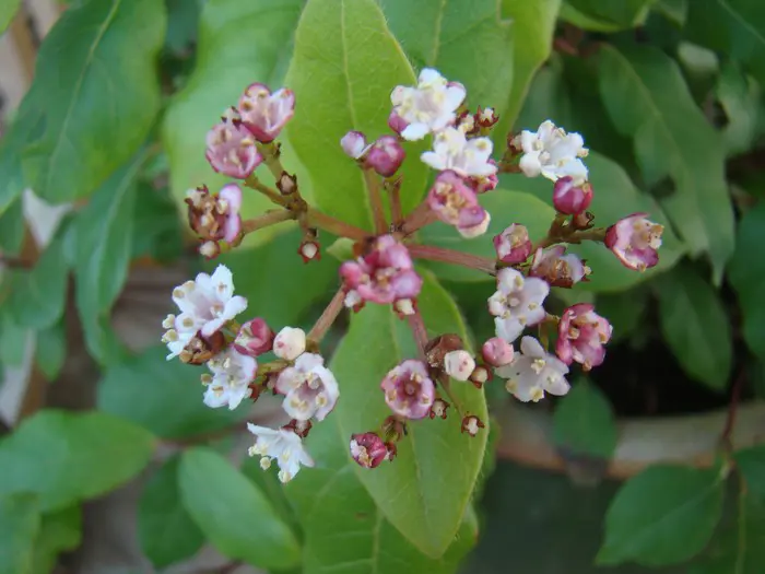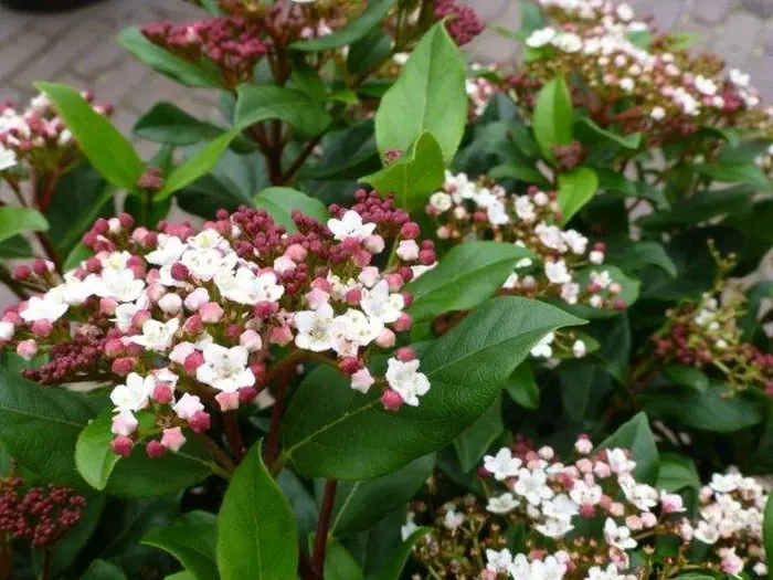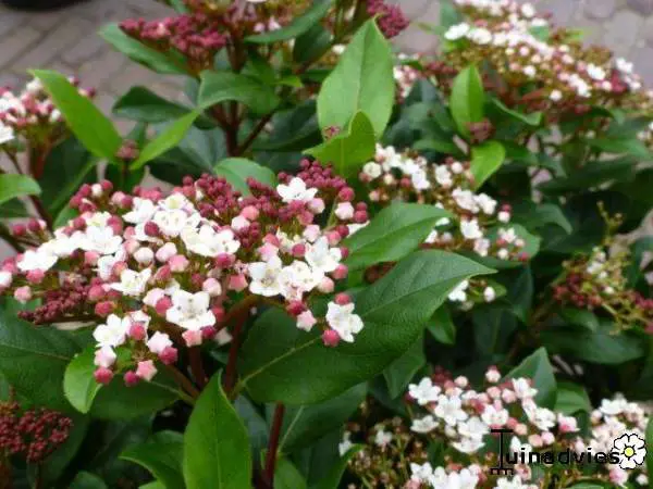 Viburnum tinus 'Gwenllian' is een aantrekkelijke variëteit met een bredere, compactere groei en een vroegere en rijkere bloei.