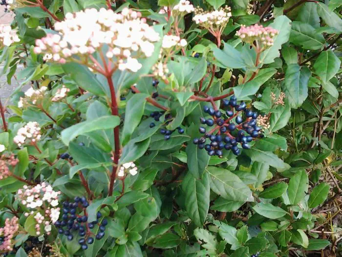 Bloeit met trosjes dieproze bloemknoppen die met roze/witte bloempjes openbloeien. De roze bloemknoppen hangen reeds al vanaf oktober aan de plant. Na de bloei volgen de zwarte besjes.