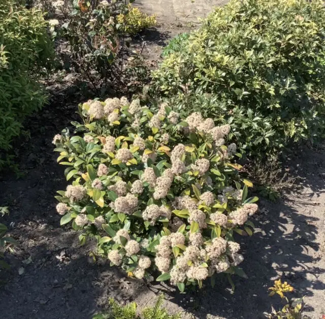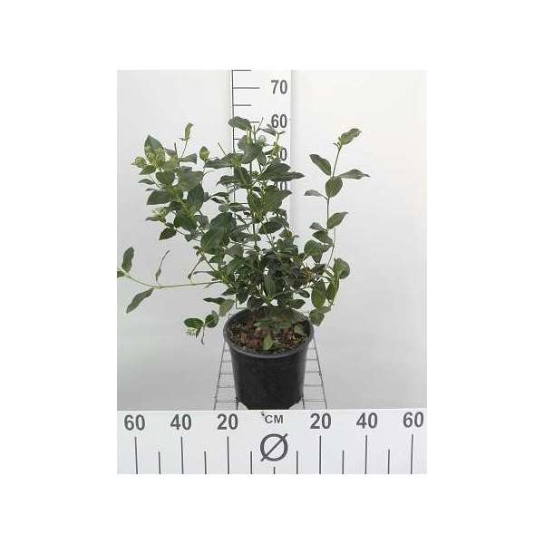 Vormt een dichte struik met wintergroene, ovale glanzende donkergroene bladeren.