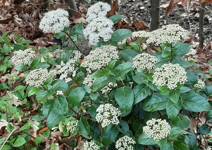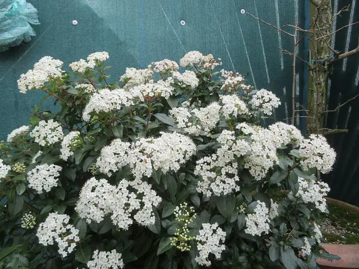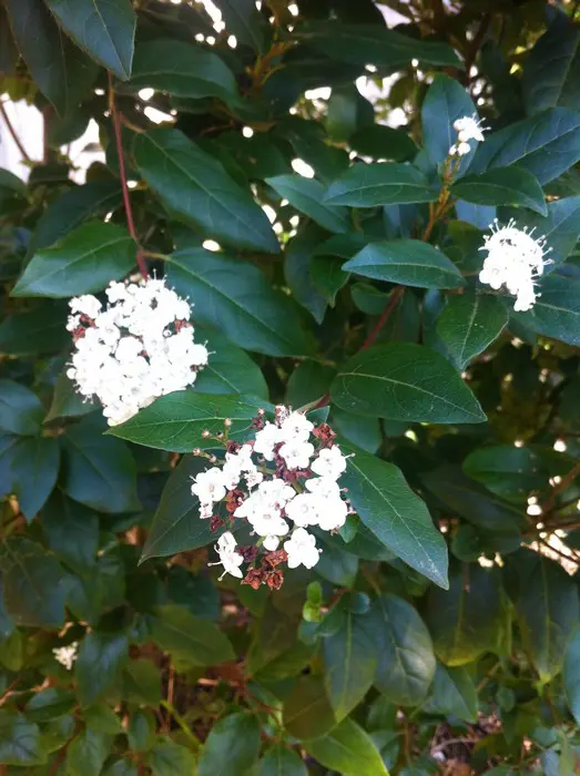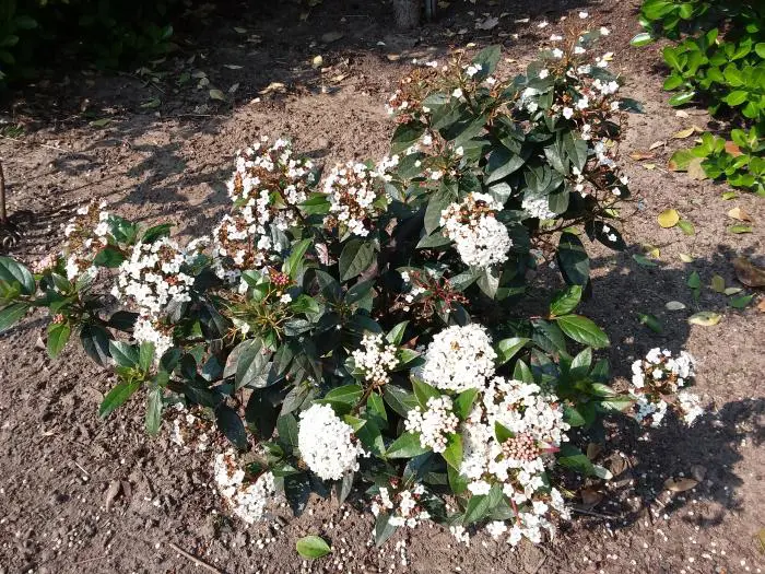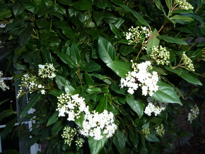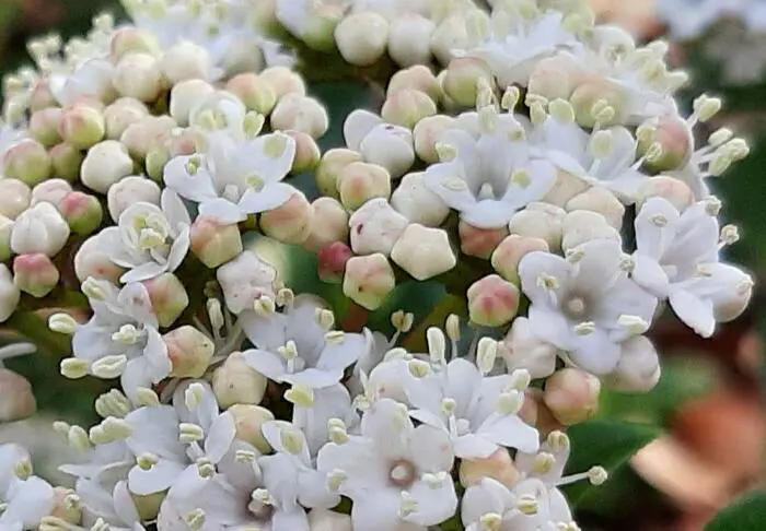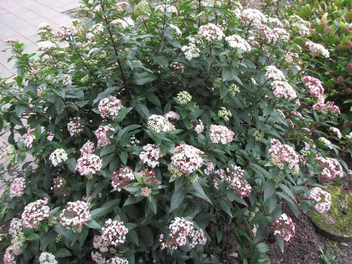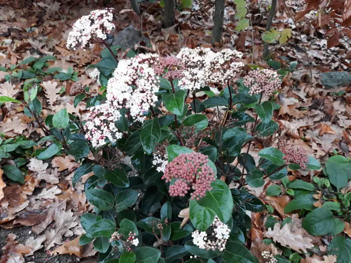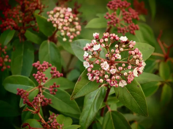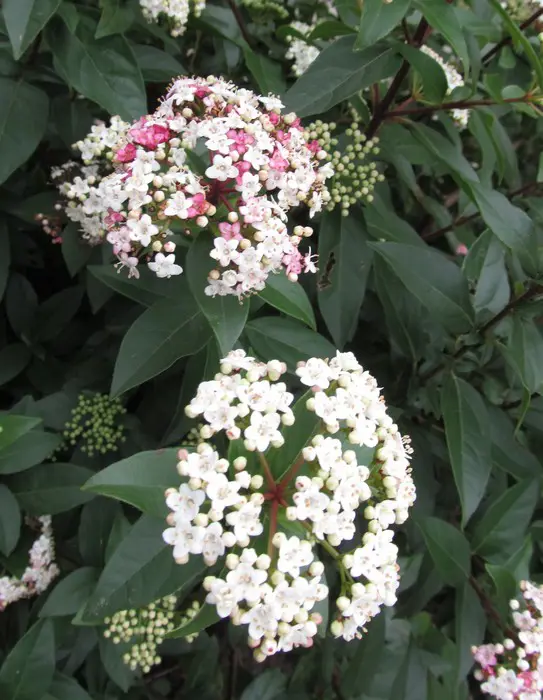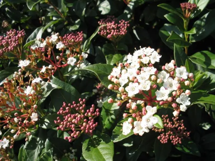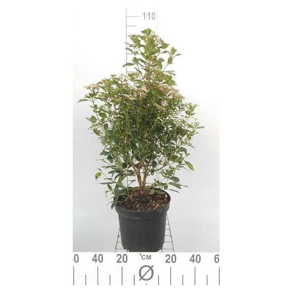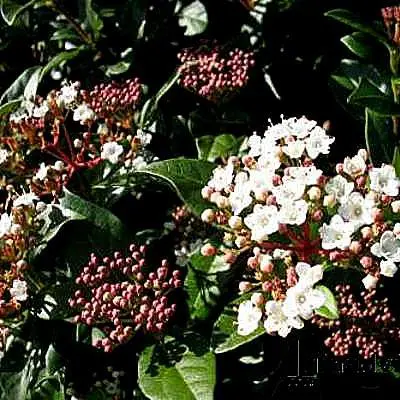 Viburnum tinus is een aantrekkelijke heester vanwege de trosjes roze bloemknoppen die met witte bloempjes openbloeien. De rozerode bloemknoppen hangen reeds al vanaf oktober aan de plant. Na de bloei volgen de zwarte bessen.
