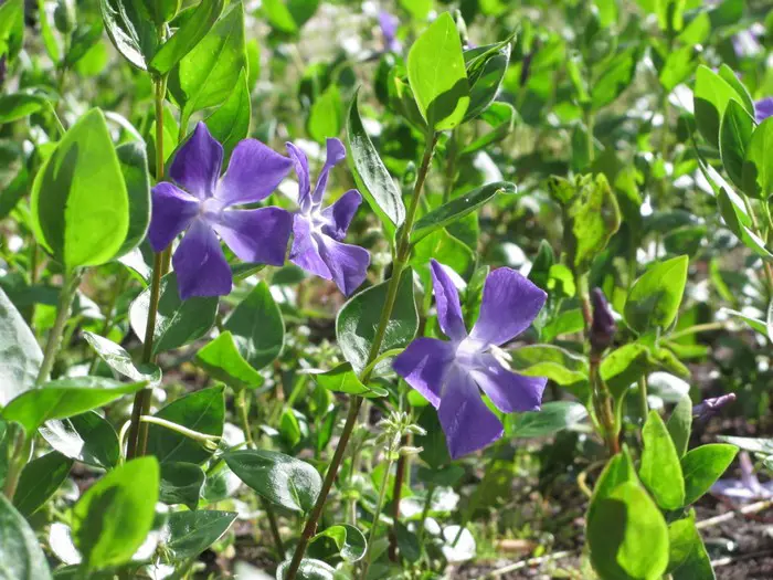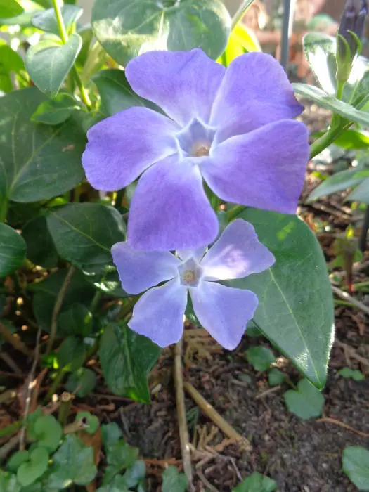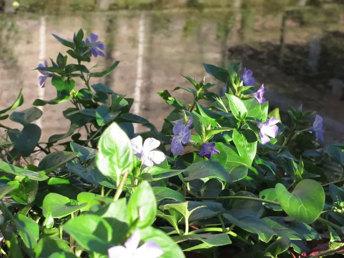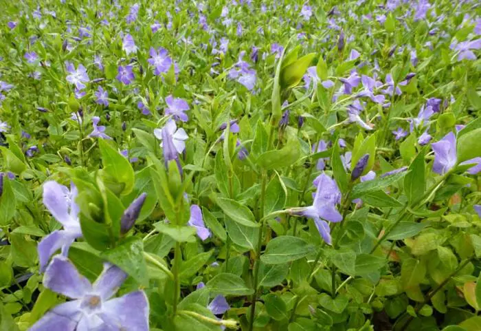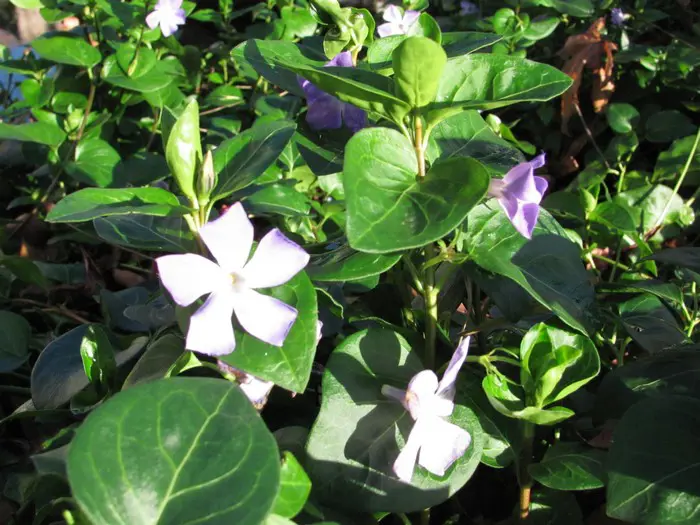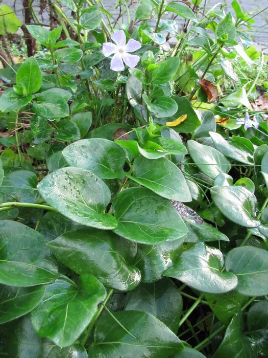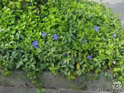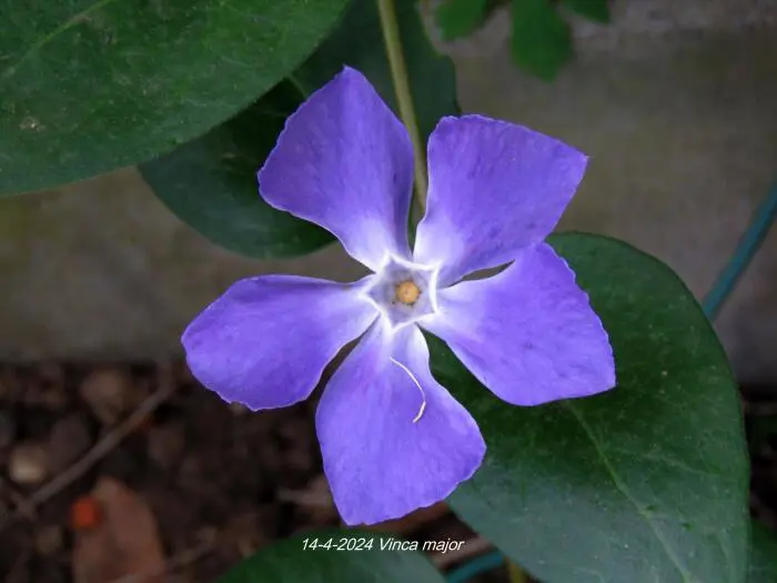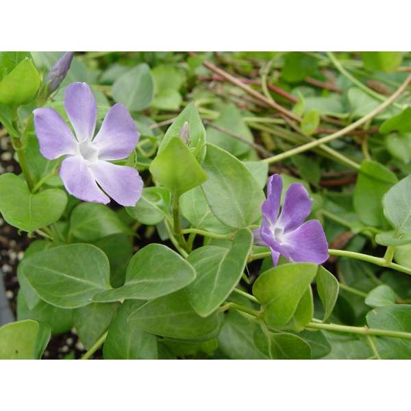 Vinca major is een groeikrachtige bodembedekker met hartvormige, leerachtige, glanzende groene bladeren en met een uitbundige bloei van mooie stervormige, paarsgetinte blauwgrijze bloemen.