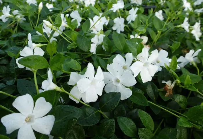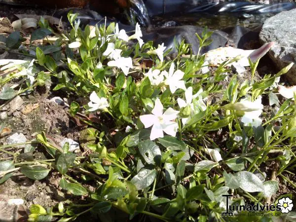 Vinca minor 'Alba' is een uitstekende tuinplant voor moeilijke plaatsen. Hij vormt een groenblijvende en dichtbegroeide bodembedekker die in het voorjaar met talrijke kleine witte sterrenbloemen bloeit.