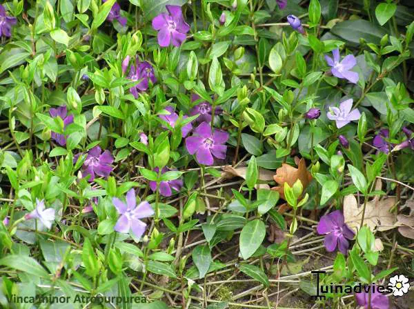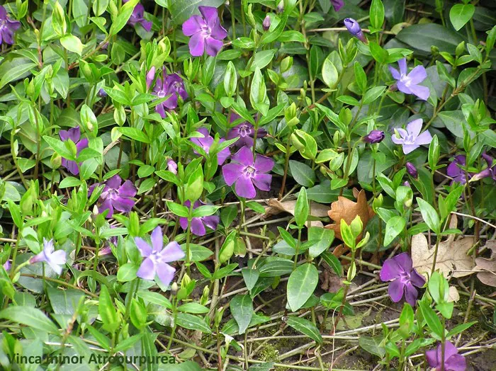 Vinca minor 'Atropurpurea' is een uitstekende tuinplant voor moeilijke plaatsen. Hij vormt een groenblijvende en dichtbegroeide bodembedekker die in het voorjaar met talrijke kleine paarsrode sterrenbloemen bloeit.