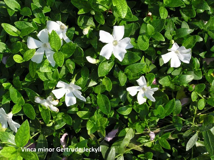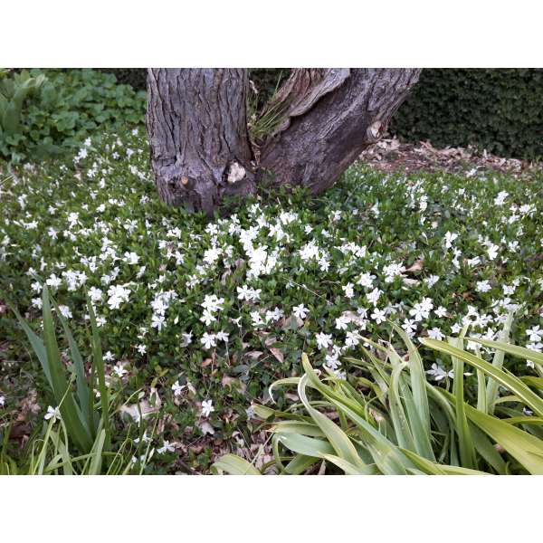 Vinca minor 'Gertrude Jekyll' is een laag groeiende variëteit (5cm).