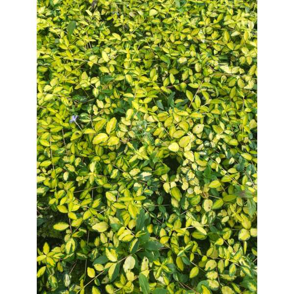 Bladeren zijn heldergeel met groene markeringen.