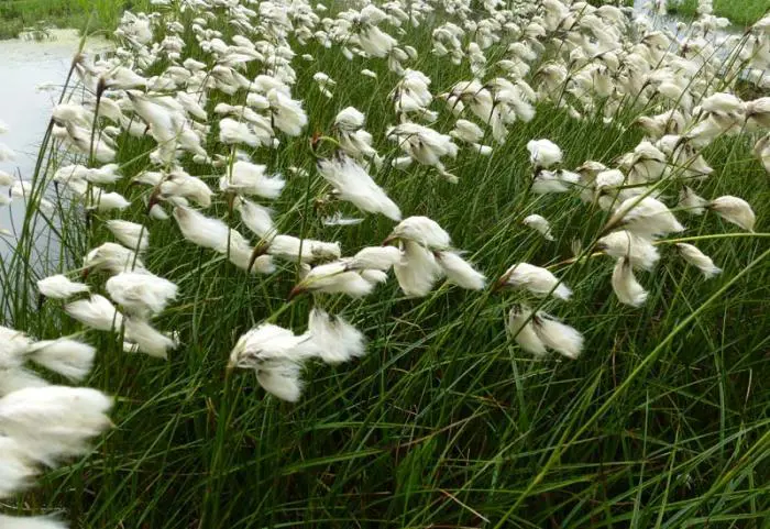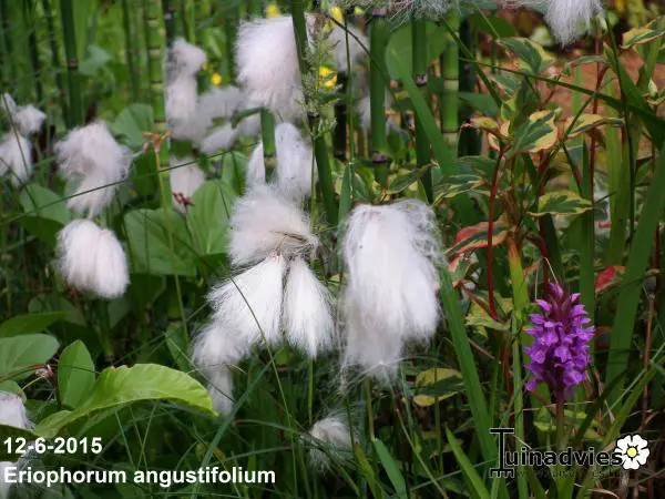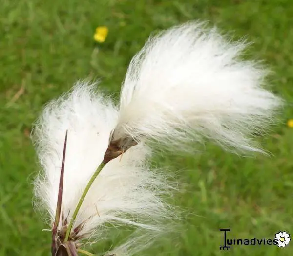 Heeft witte wollige pluimen en grasachtig lang blad.