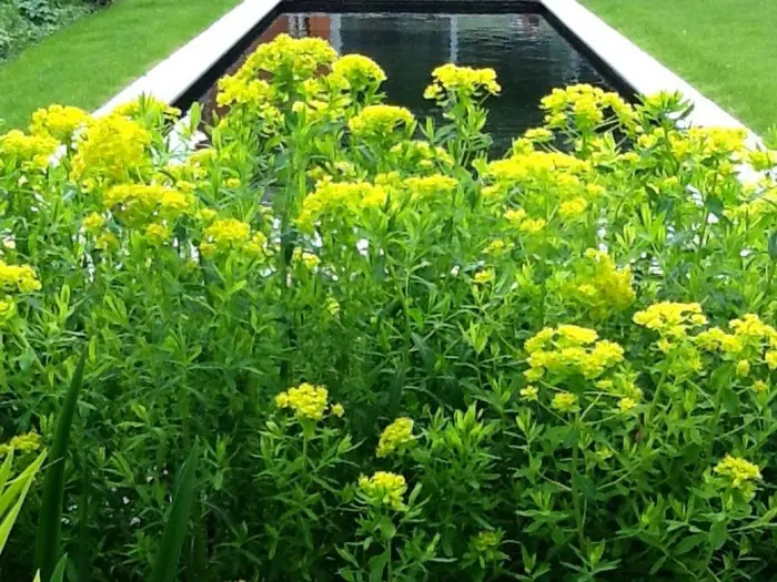 Euphorbia palustris vormt grote planten met schermen van helder geelgroene schutbladeren aan rechtopstaande stengels van 1m hoog.