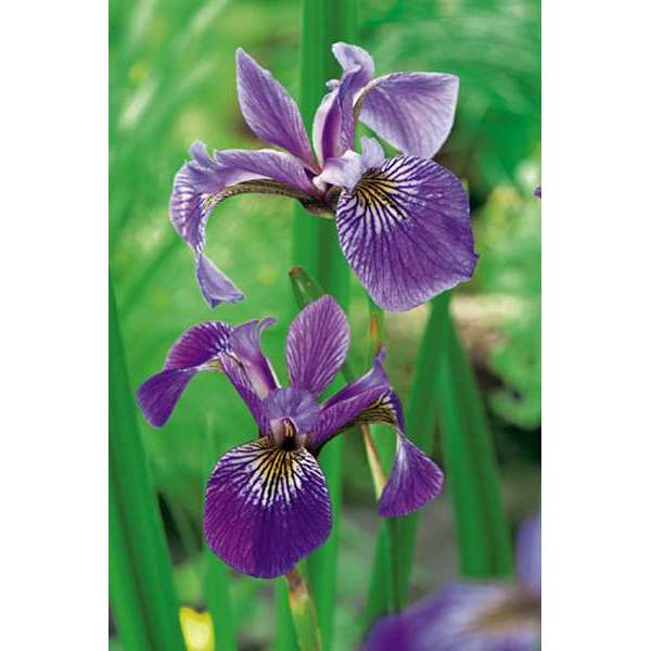 Iris versicolor heeft lange zwaardvormige bladeren en bloeit met violetpaarse bloemen met een witte markering, geel in het centrum.