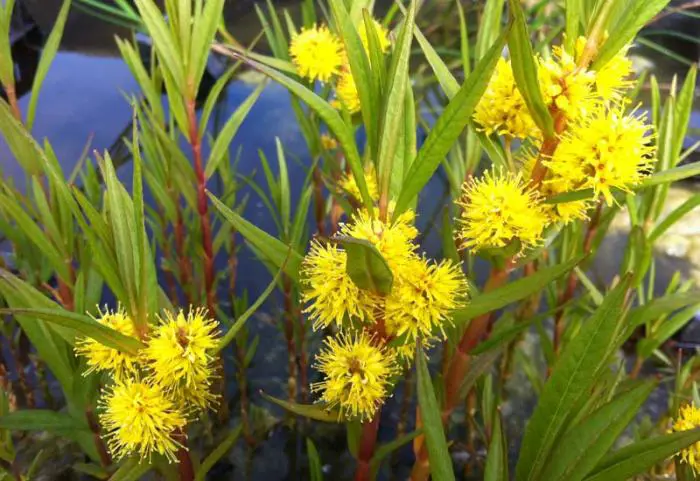 Bloeit aan de stengel tussen de bladeren met ronde trosjes van gele bloempjes met uitstekende lange meeldraden.
