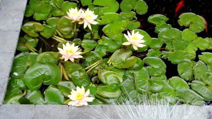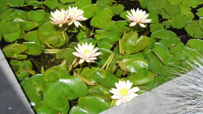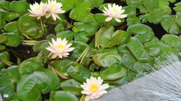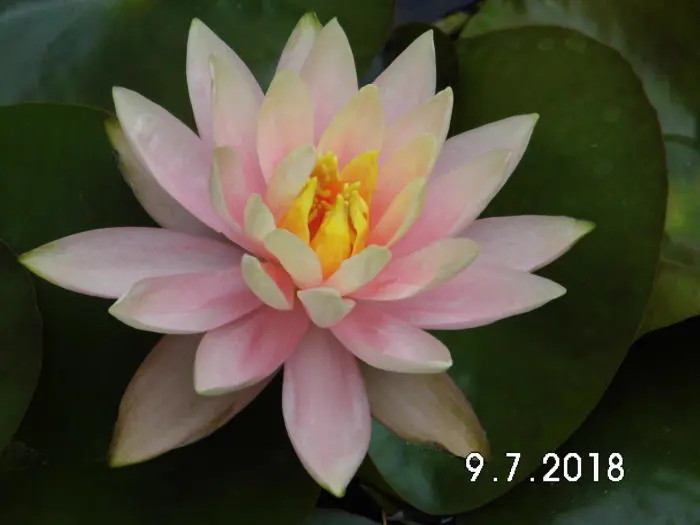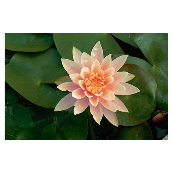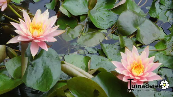 Komvormige zalmroze tot perzikkleurige bloemen met geel hart drijven tussen de grote bladeren op het water.