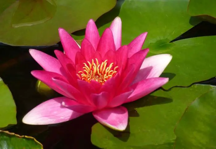 Grote komvormige rode bloemen met in het hart vermiljoenrode meeldraden met gele tip, drijven tussen de bladeren op het water.
