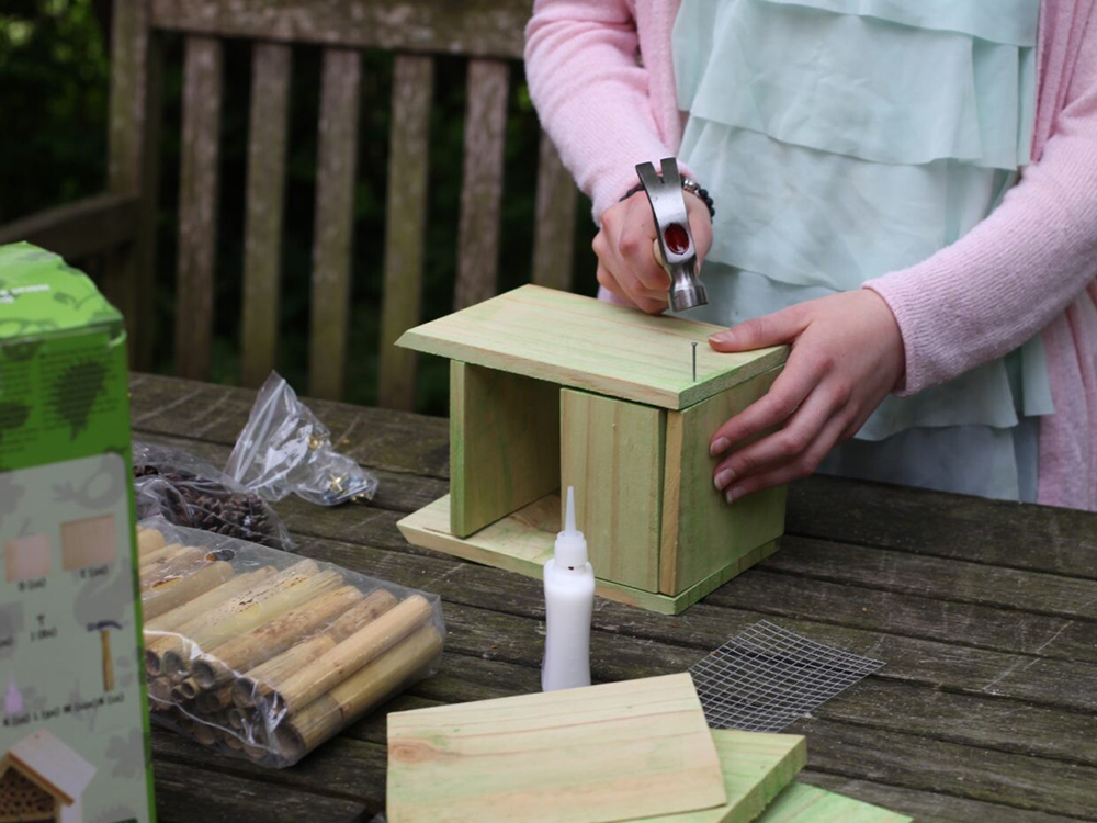 Het doe-het-zelf insectenhotel kan met de meegeleverde spijkers, hamer en houtlijm eenvoudig worden geassembleerd. Het biedt onderdak aan diverse soorten nuttige insecten zoals zachtaardige solitaire bijen die de bloemen bestuiven en oorwormen die bladluizen bestrijden in de tuin.
