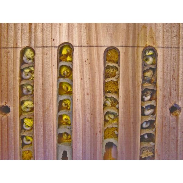 Wanneer ze de bijenkast hebben gevonden, gaat het vrouwtje op zoek naar stuifmeel. Ze verzamelt dit in één van de nestbuisjes en legt er een eitje in. Vervolgens metselt ze het buisje dicht met een mengsel van modder en speeksel. In deze kamer groeit het eitje uit tot larve, voedt de larve zich met stuifmeel, en verpopt de larve tot volwassen bij. Per opening worden meerdere van deze kamers gebouwd. De poppen overwinteren in het hotel en in het voorjaar bijten de verpopte inidviduen zich een weg naar buiten. De bijen die in de nestkast worden geboren, keren vaak terug om hun eigen eitjes erin te leggen, de cyclus begint opnieuw.
