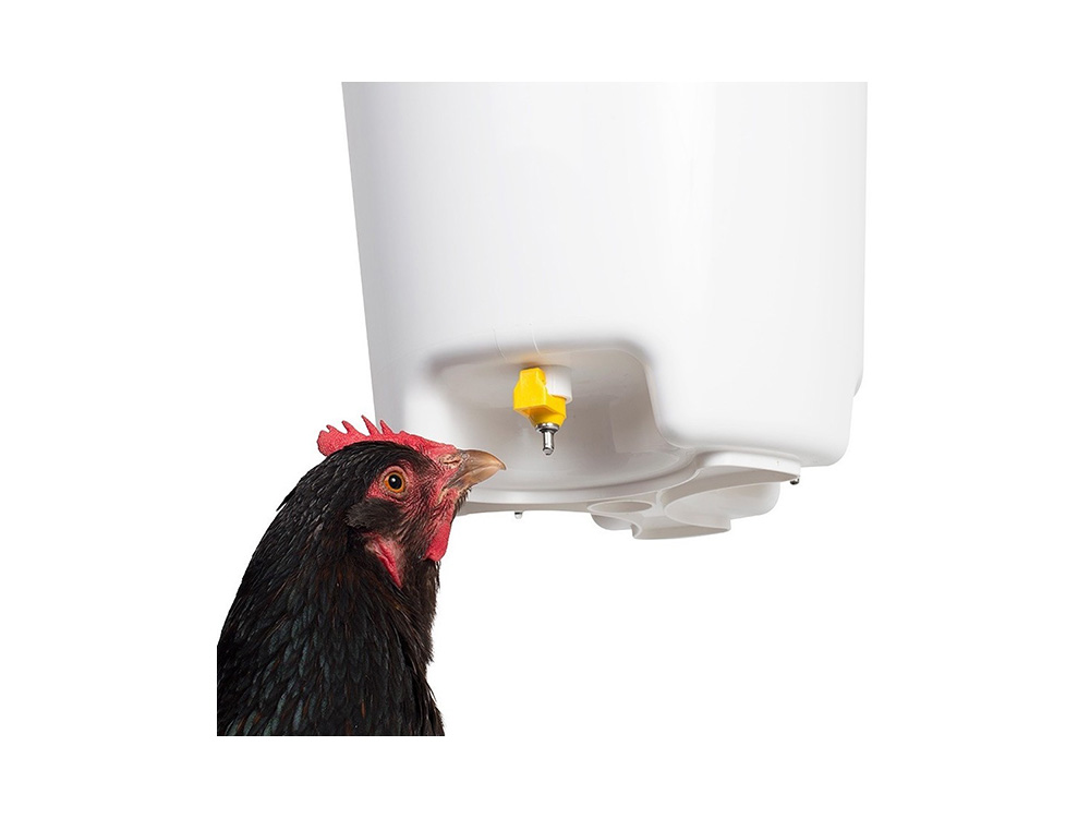 Het water in het afgesloten reservoir blijft steeds vrij van ziektekiemen. De kippen, fazanten of ander pluimvee kunnen het water opnemen via drie nippels. De emmer wordt geleverd als complete set met drie drinknippels, een deksel en een stevige hangbeugel.