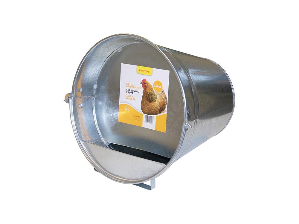 De constructie van de emmer zorgt ervoor dat hij niet leegloopt en dat de kippen of ander pluimvee het water via een smalle drinkopening kunnen opnemen.