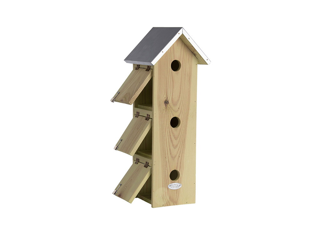 Een leuke mussennestkast met 3 kamers boven elkaar, goed voor 3 mussenfamilies. De mussenflat heeft 3 aparte nestkastjes omdat mussen koloniebroeders zijn en graag bij elkaar in de buurt nestelen. Elke kamer is voorzien van een eigen invliegopening en een afzonderlijk deurtje om de kamers te kunnen reinigen na het broedseizoen.