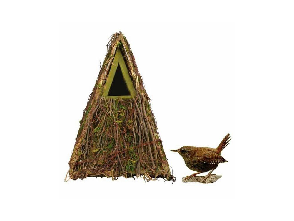 De winterkoning is een klein vogeltje dat houdt van een goed verstopt en gecamoufleerd nest. Daarom is deze nestkast bekleed met takjes, mos en grassen. Hierdoor gaat het volledig op in zijn omgeving en valt het niet op.
