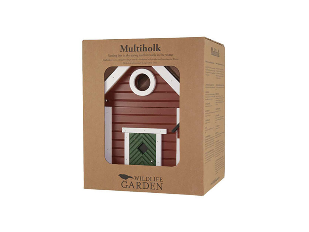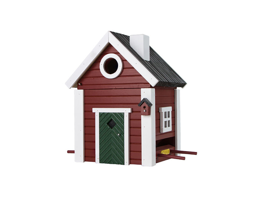 Vogelhuis en voederhuis onder 1 dak ontworpen naar het voorbeeld van de traditionele woningen in Scandinavië of de Amerikaanse huizen van New England. Dit unieke vogelhuisje kan zowel op een paal als tegen een schutting/muur bevestigd worden met het bijgeleverde bevestigingsmateriaal. Het vogelhuisje is te gebruiken als voederhuis in de winter en als nestkastje voor mezen in de lente.