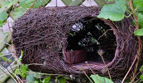 Deze unieke nestbuidel is ontwikkeld in samenwerking met Simon King, natuurkenner en wildlife cameraman, gebruik makend van zijn jarenlange kennis. Roodborstjes geven de voorkeur aan een open nestkast die makkelijk toegankelijk is maar toch verborgen is voor predatoren. De ingang is open maar de nestruimte zelf is verborgen achter de zijwand en bedekt door het dak. De basis van de buidel is van rotan met een lage scheidingswand tussen de ingang en de nestplaats.
