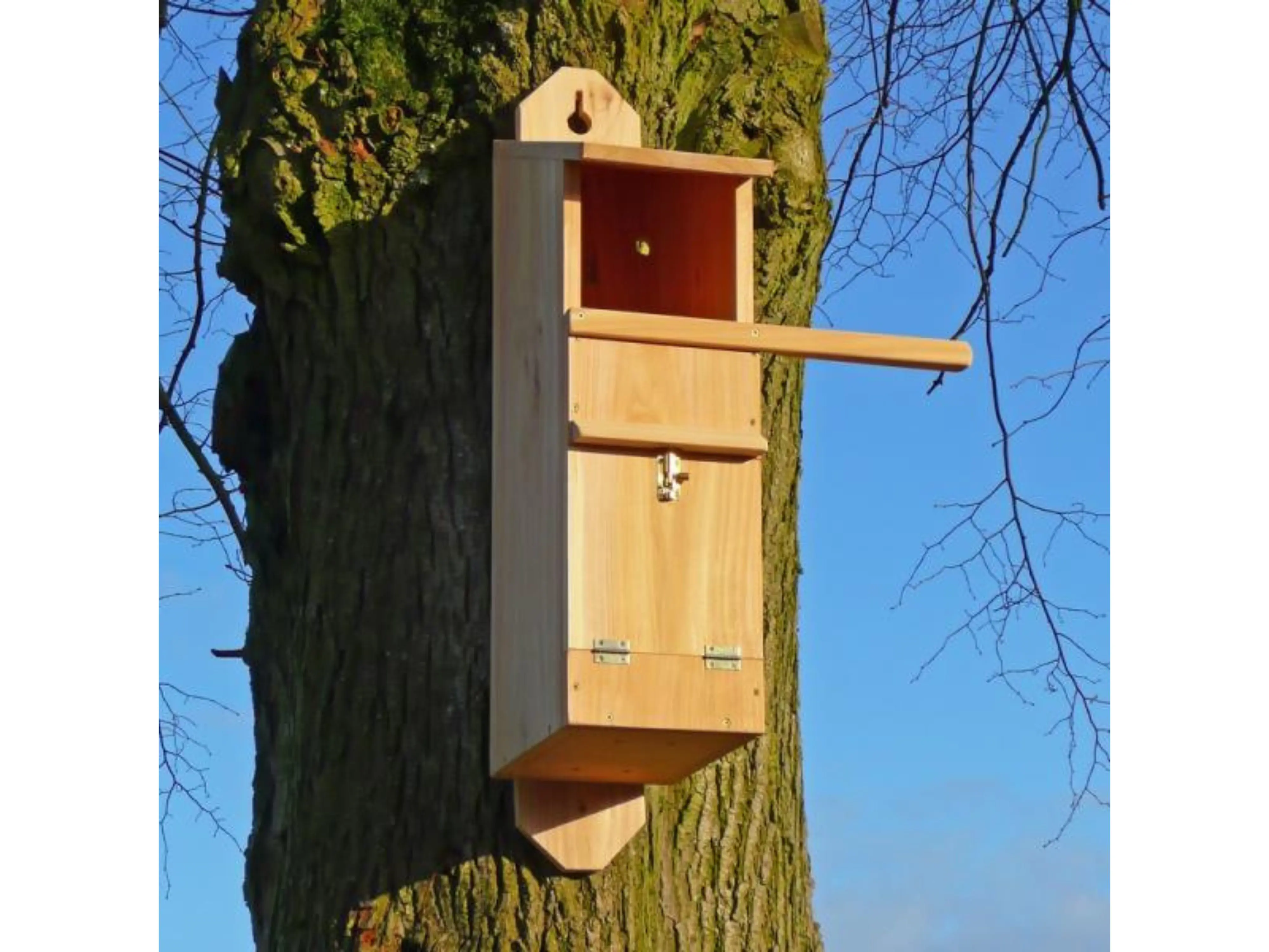 Het inspecteren van de bosuilenkast is mogelijk via het stevige luik. De uilenkast is eveneens voorzien van een lange zitstok waarop de vogels kunnen rusten. De kast is ook uitgerust met een stevig bevestigingsmechanisme met bijhorende schroeven.