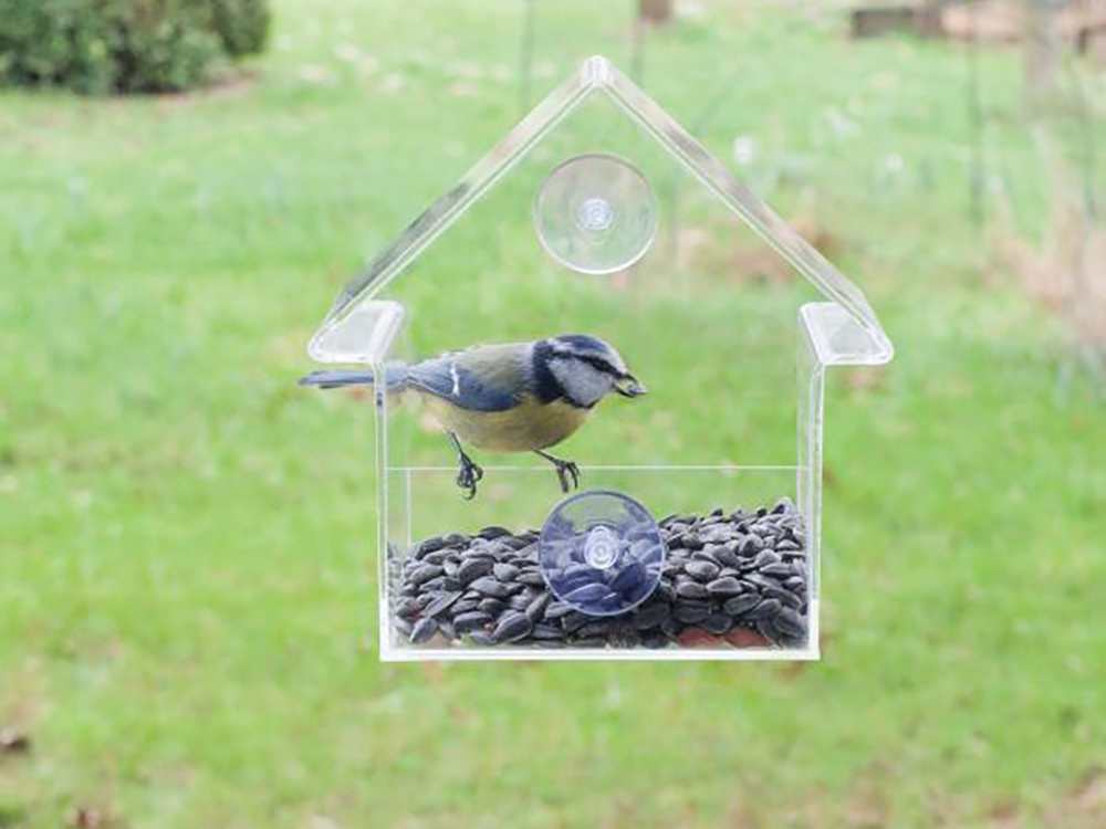 Kleine tuinvogels komen in de koude wintermaanden makkelijk tot bij het raam en met dit raamvoederhuis kan je ze uitstekend van binnenshuis observeren.