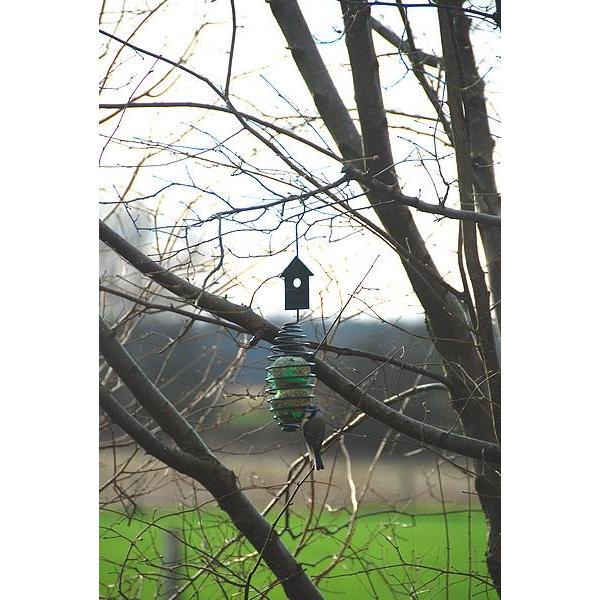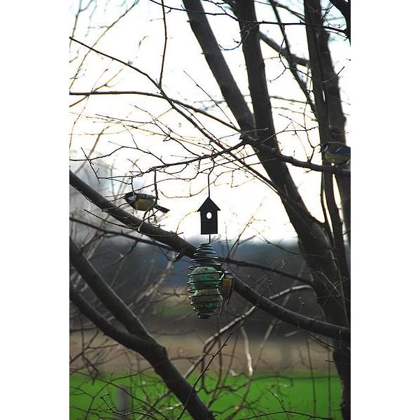 Met deze decoratieve donkergroene vogelvoederveer van Esschert Design, hang je moeiteloos vetbollen op in de tuin of op het balkon. Bovenop staat een huisje of een vogelfiguur als decoratie waardoor deze vetbolspiraal een unieke uitstraling heeft. De vogels in de tuin gaan eraan hangen en met gemak het vet uit de bol halen, wat een prachtig schouwspel oplevert.