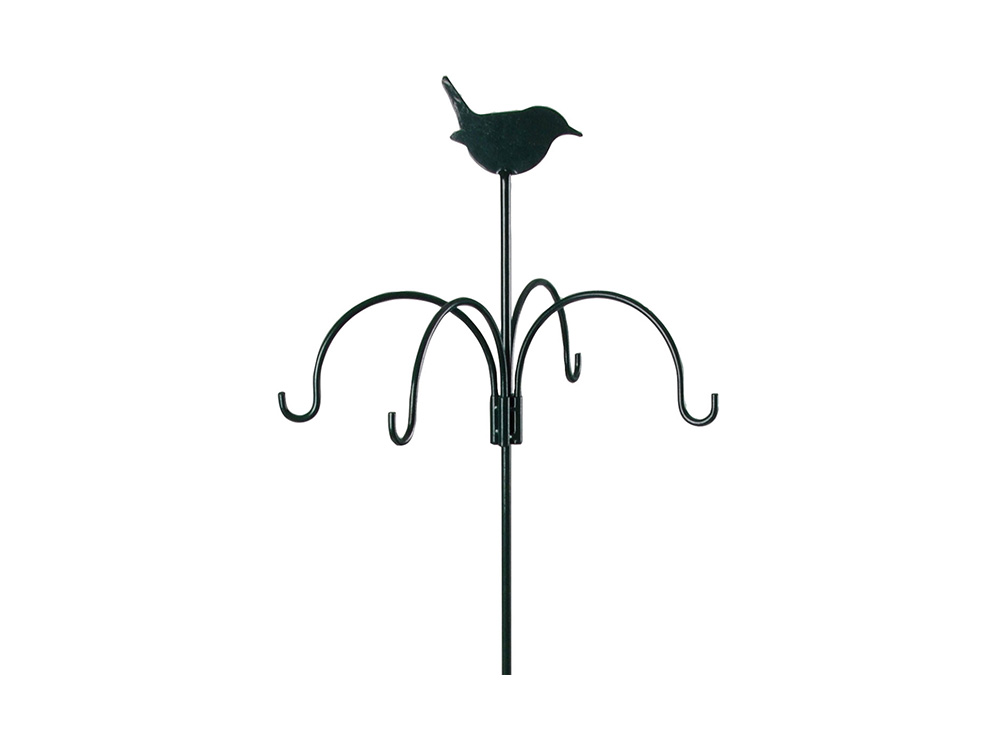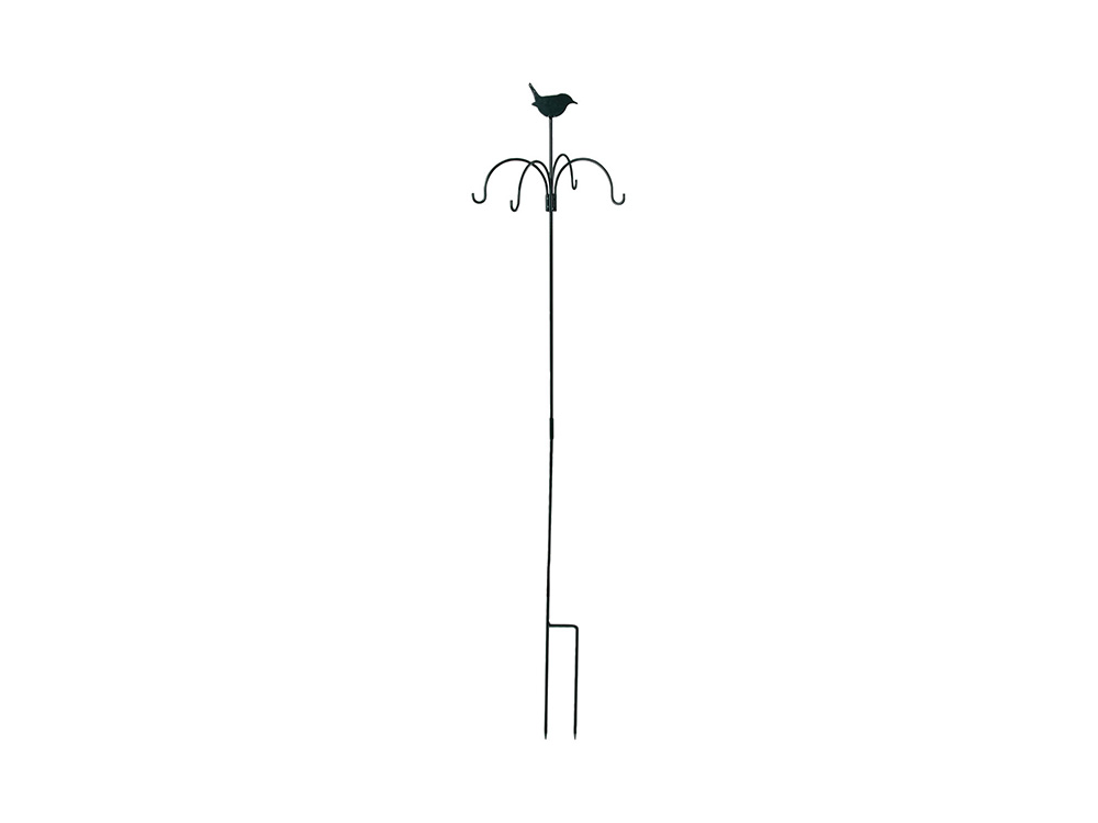 Dit voederstation van Esschert Design met vier haken is perfect voor het ophangen van vetbollen, vogelvoersilo's en vetblokhouders. Het is eenvoudig te monteren en dankzij de grondverankering kan het systeem stevig in de grond worden geprikt. Bovendien prijkt er bovenaan de voederhanger een mooi decoratief vogeltje.