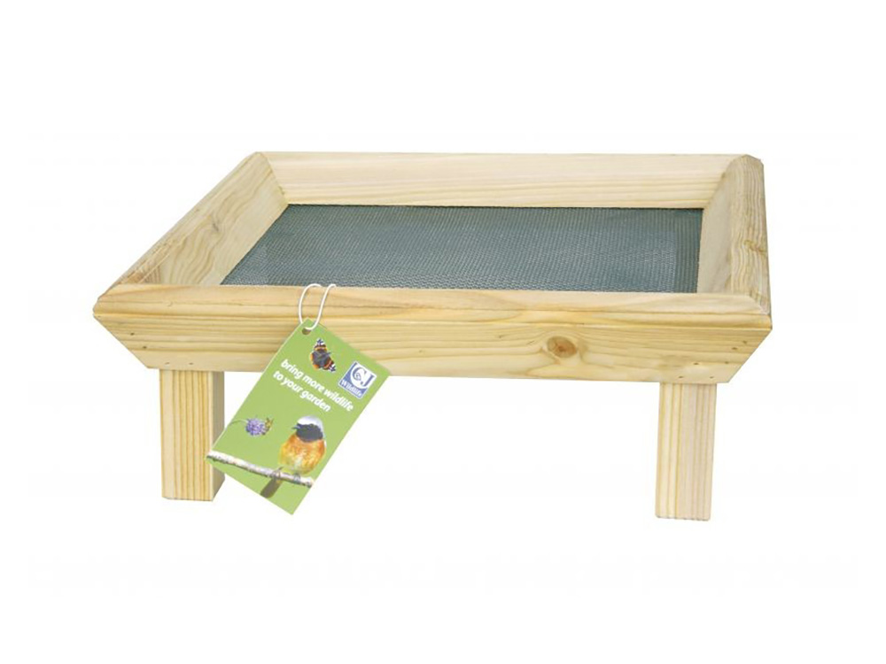 Deze houten voedertafel is voorzien van een bodem in gaasdraad en 4 houten pootjes zodat ze ongeveer 7 cm van de grond staat, nog steeds laag genoeg voor onze gevleugelde vrienden die liever hun graantjes van de grond meepikken.