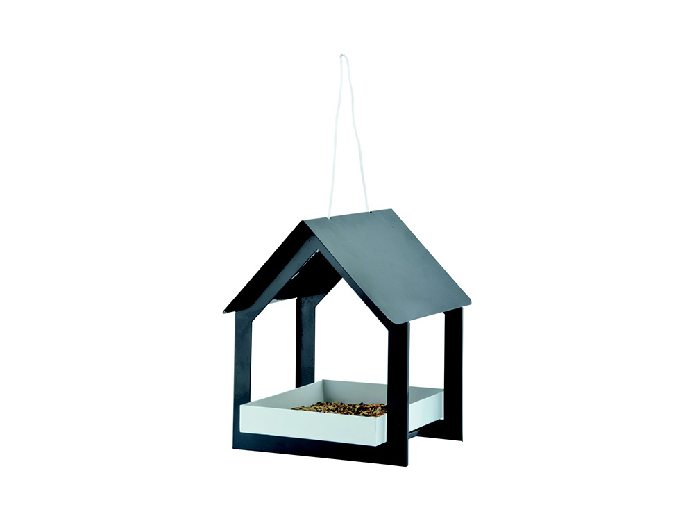 Vul deze voedertafel met een lekkere zadenmix en hang ze op een beschutte, goed bereikbare en zichtbare plaats in de tuin. Dit overdekte huisje is voorzien van een stevige zwarte hanglus.