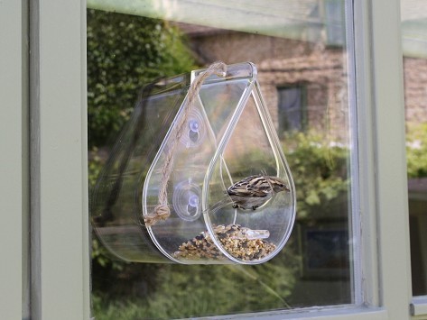 Leuk transparant raamvoederhuis in de vorm van een druppel. Het is jouw kans om vogels van dichtbij te zien eten.