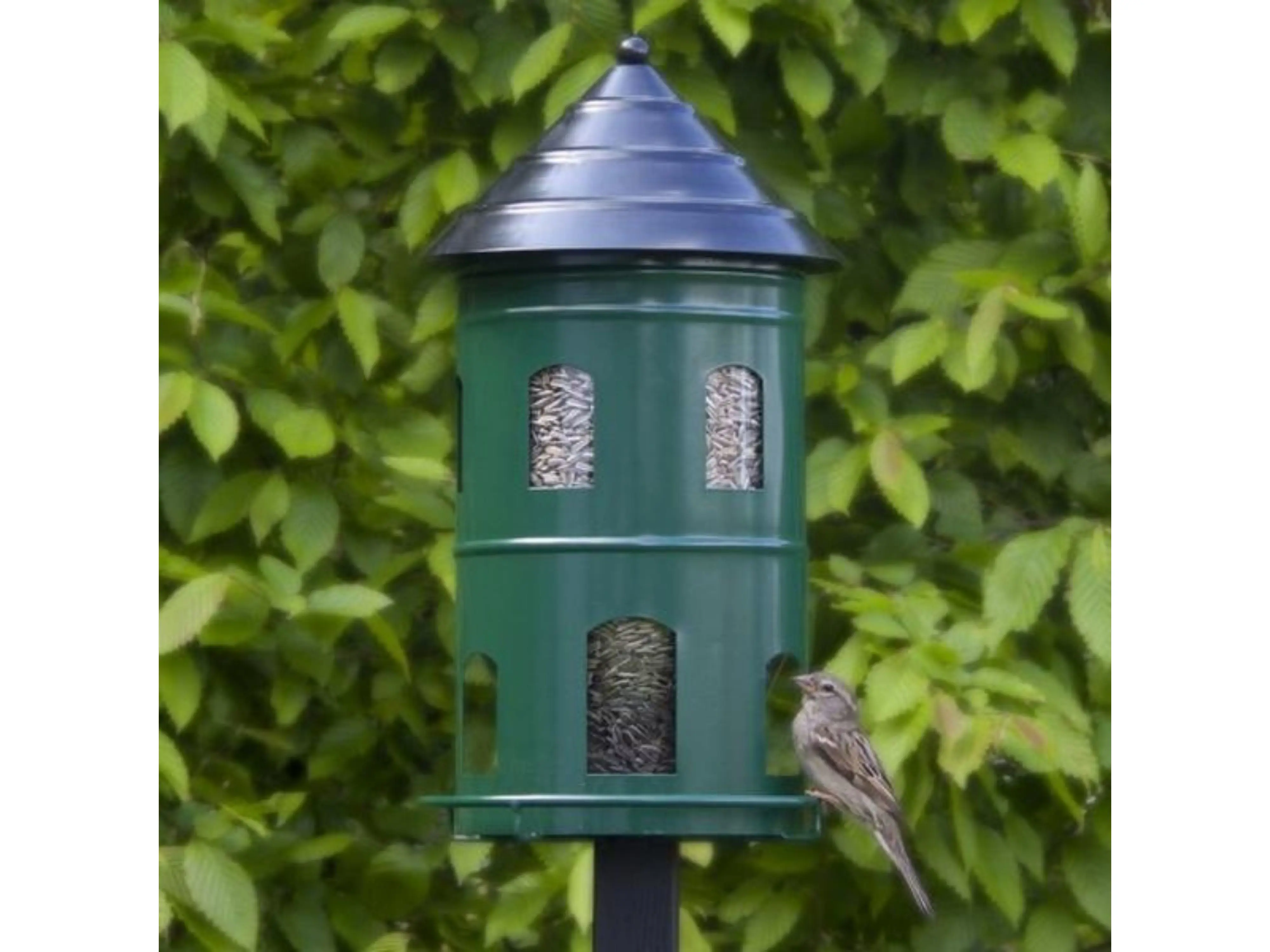 De reuze voedersilo heeft meerdere voerdispensers zodat veel vogels tegelijkertijd kunnen eten. Door de vele raampjes is het makkelijk van veraf te zien hoeveel de silo nog met voer gevuld is. De voedersilo wordt het best op een paal gemonteerd met de bijgeleverde schroef. Het voederhuis is gemaakt van waterbestendig gepoederlakt staal en de container van gerecycleerd kunststof.