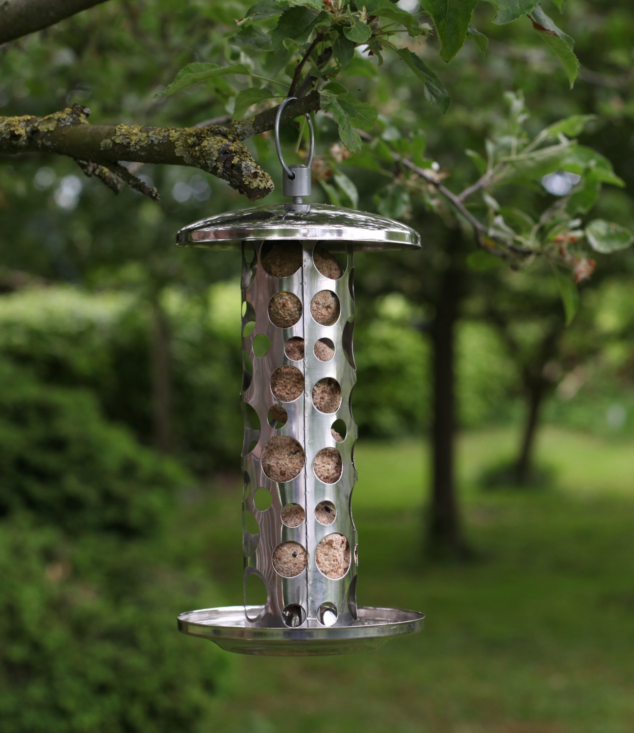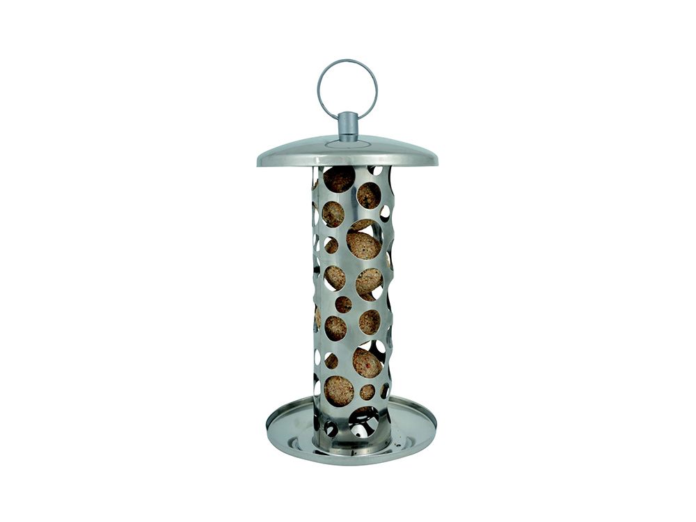 Moderne en stijlvolle vetbollenautomaat van Esschert Design uit roestvast staal. Deze voederautomaat biedt plaats aan 4 tot 5 vetbollen en is geschikt voor vetbollen zonder netje. Een groot voordeel van deze automaat is dat het voorkomt dat grote vogels zoals kauwen en eksters er met hele mezenbollen vandoor gaan.